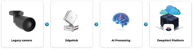 EdgeHub sits on-site, securely connecting cameras to DeepAlert’s AI Cloud. A simple, reliable flow that unlocks modern capability from existing infrastructure.